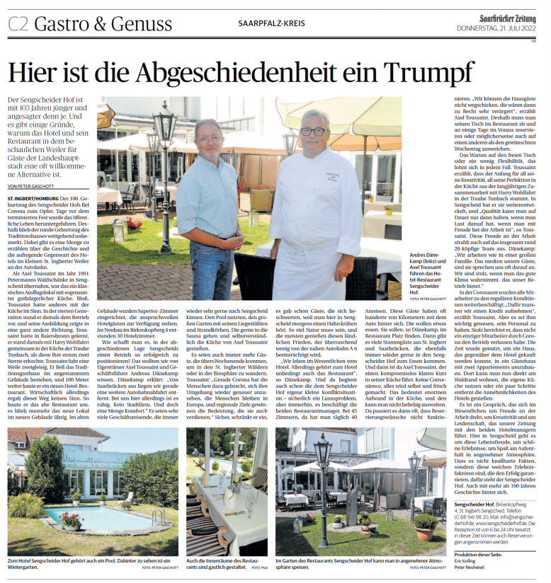 St. Ingbert Der Sengscheider Hof ist mit 103 Jahren jünger und angesagter denn je. Und es gibt einige Gründe, warum das Hotel und sein Restaurant in dem beschaulichen Weiler für Gäste der Landeshauptstadt eine oft willkommene Alternative ist.