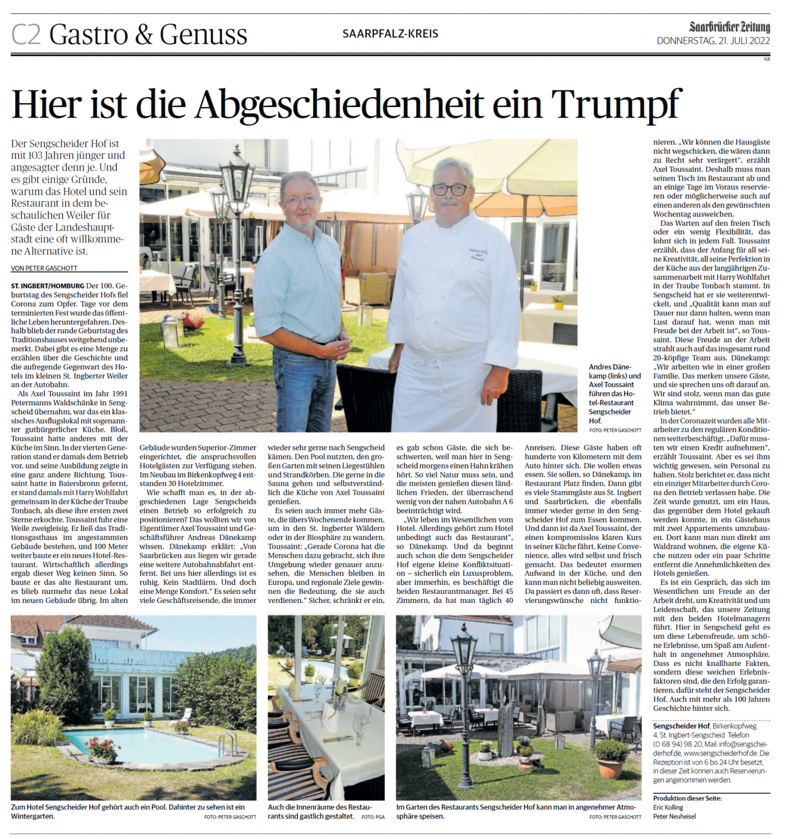 Wie schafft man es, in der abgeschiedenen Lage Sengscheids einen Betrieb so erfolgreich zu positionieren? Das wollten wir von Eigentümer Axel Toussaint und Geschäftsführer Andreas Dänekamp wissen. Dänekamp erklärt: „Von Saarbrücken aus liegen wir gerade eine weitere Autobahnabfahrt entfernt. Bei uns hier allerdings ist es ruhig. Kein Stadtlärm. Und doch eine Menge Komfort.“ Es seien sehr viele Geschäftsreisende, die immer wieder sehr gerne nach Sengscheid kämen. Den Pool nutzten, den großen Garten mit seinen Liegestühlen und Strandkörben. Die gerne in die Sauna gehen und selbstverständlich die Küche von Axel Toussaint genießen.